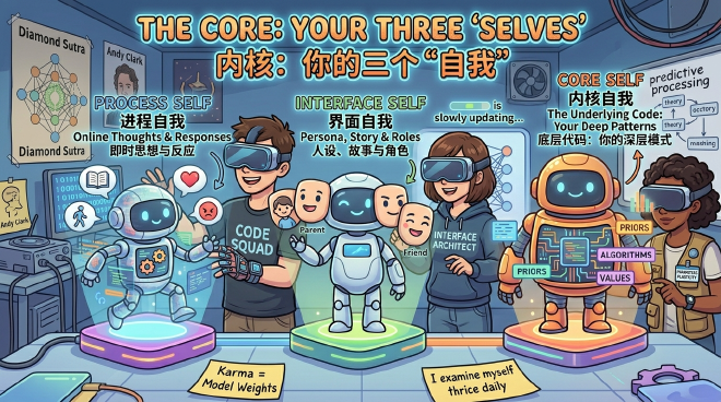 If you were an AI, when you react to external stimuli, you only change the Process Self. When you say, “I’m going to see the leader later, need to be steady,” you are temporarily writing a prompt for the Interface Self. Sometimes, with a good prompt, even a mediocre model can perform like an expert. But that’s just activation, not an increase in capability: once in a high-pressure environment, the persona will collapse, and the situation will eventually be handed over to the Core Self.