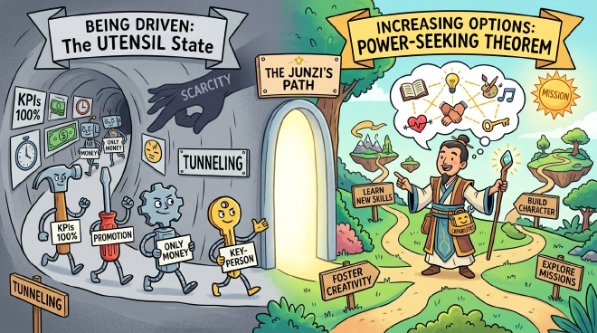 Even if there are no immediate rewards, we should actively explore because we need to empower ourselves. A Junzi does not oppose optimization or ignore objective functions, but treats them as means while focusing on building a system that expands capabilities and options. “Junzi Bu Qi” is not against specialization, but against the obsession with specialization as an identity.
