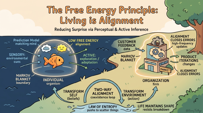 This is the fundamental insight of the Free Energy Principle. Let me compare it to illustrate. Previously, people thought life lived by “stimulus-response”: see food and open your mouth, see danger and run. The Free Energy Principle tells you: no. That’s too slow and you’ll likely die because the environment is complex and ever-changing! True life must have intelligence; it must be a “prediction machine.” You cannot wait for the environment to act upon you; you must stay ahead of time. Alignment means you constantly predict what will happen in the environment, ensuring the gap between your expectations and your sensory inputs isn’t too wide, and that environmental changes align with your survival needs.